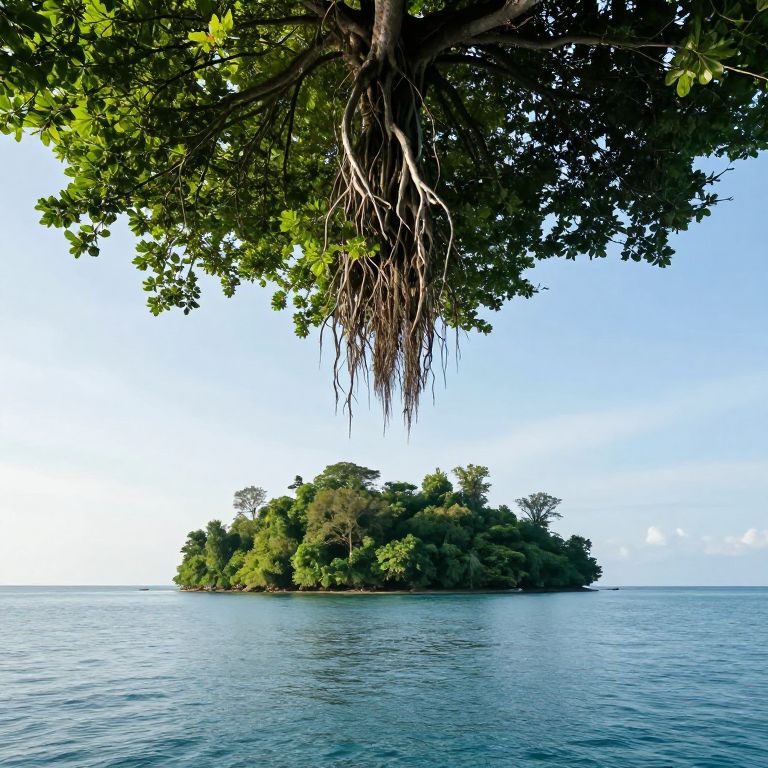 Suspended above a tranquil sea, a lush island floats serenely, its trees growing upside-down with roots cascading into the air, mirroring the serene landscape below—a surreal realm where gravity defies convention and nature bends to the whims of imagination.