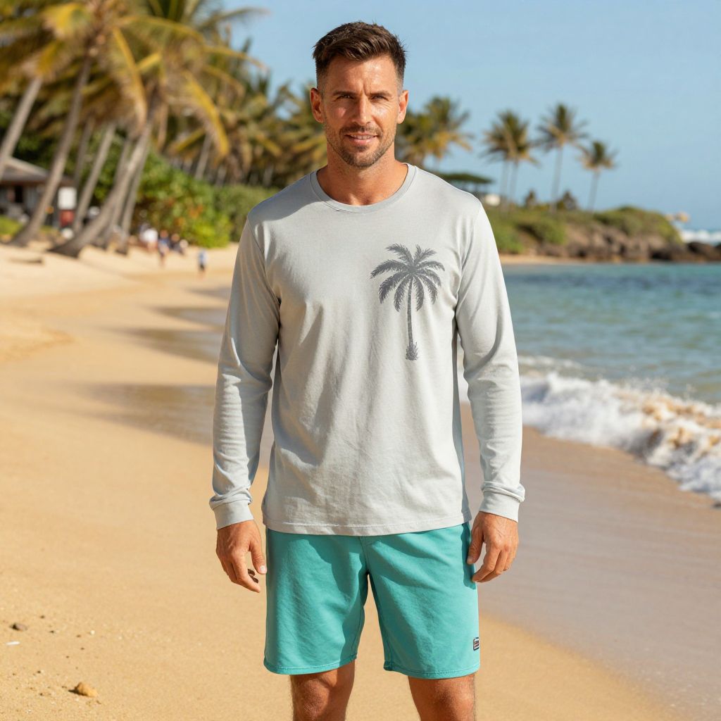 A man, light grey long sleeve tee with palm tree graphic, teal boardshorts, standing on golden sands, turquoise waves, swaying palm trees, cinecolor style, relaxed smile, sun-kissed skin. Man has masculine face and piercing eyes