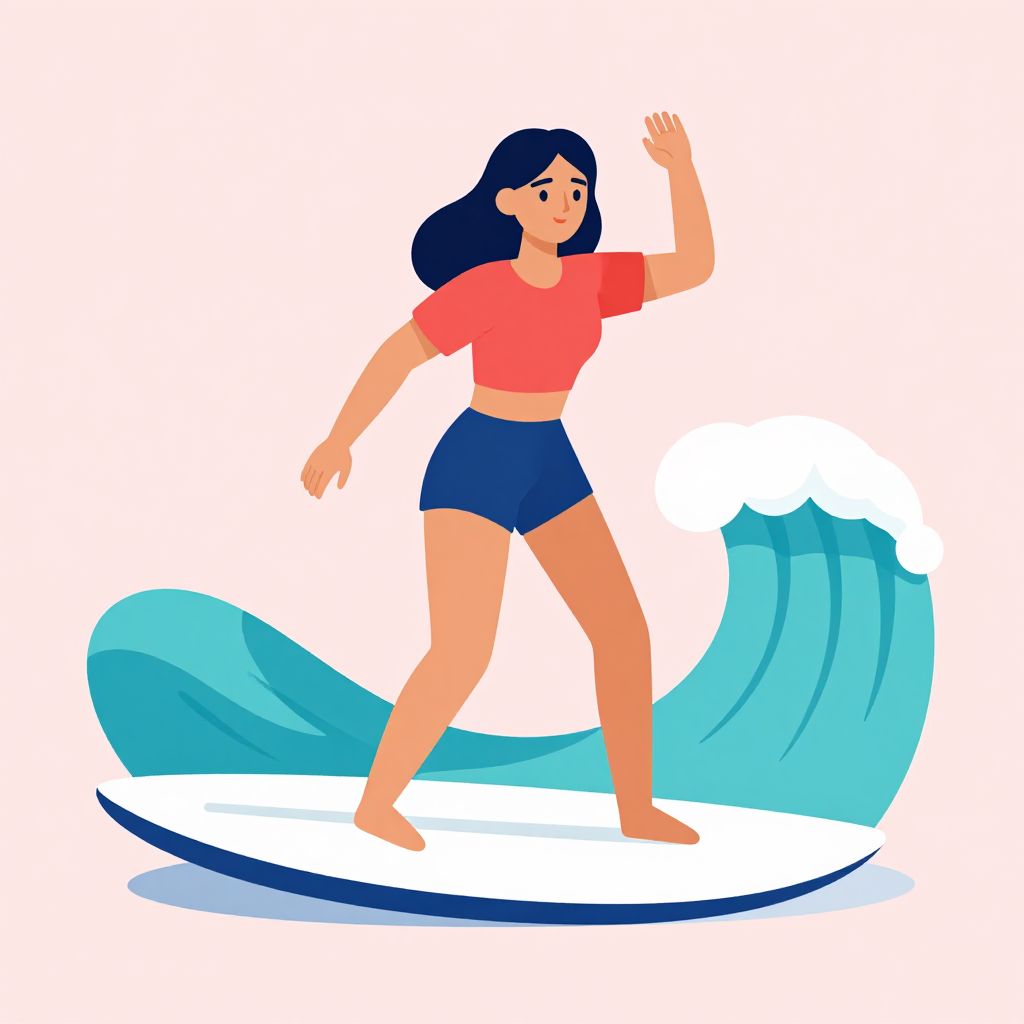 Digital illustration of a woman with black hair, pink tank top, and blue shorts surfing a large blue wave, smiling confidently.