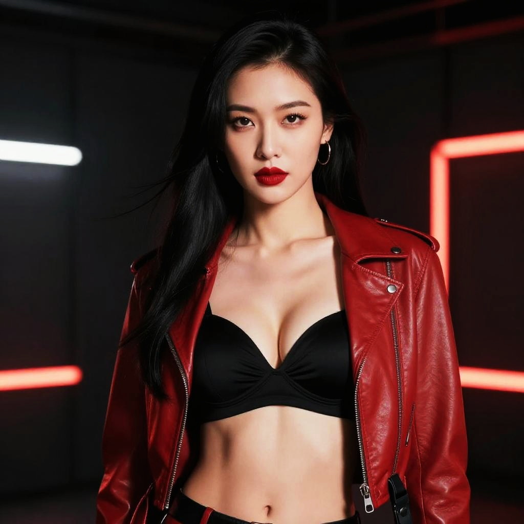 Photograph of an Asian woman with long black hair and red lipstick, standing confidently. She's wearing a red leather jacket with black straps and a black bra, showcasing her midriff. The background is dark with red and white lights, giving a dramatic, modern vibe. Her expression is serious and composed, and she has a slender, attractive physique.