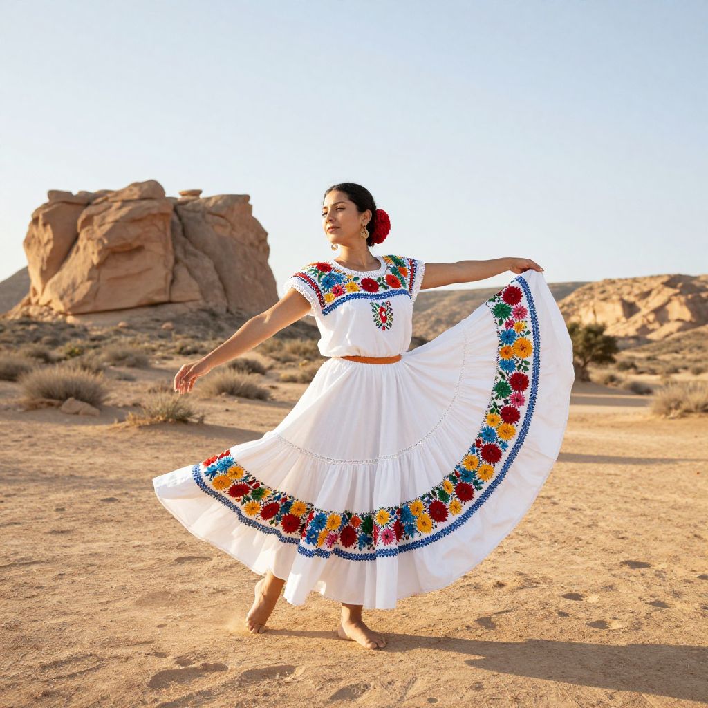 Embracing the spirit of freedom, a woman in a flowing white Mexican dress dances lightly across the desert sands, her vibrant embroidery mirroring the sun-kissed earth beneath her feet, while the ancient rock formations stand as silent witnesses to the timeless dance of humanity and nature.