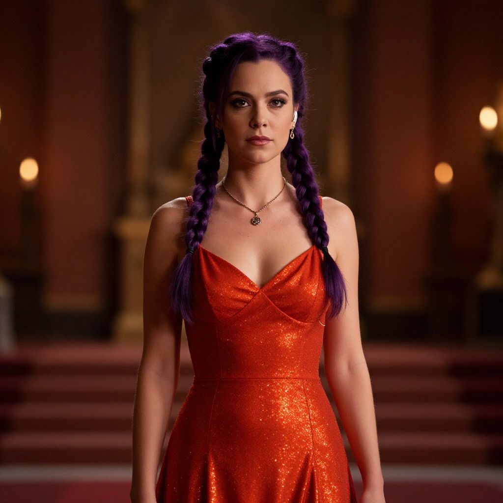 ((masterpiece, best quality, highres, realistic)) Perfect Face, cinematic film still photogenic beautiful adult woman, red orange glitter dress, high quality, high detail, standing, grand hall, rim lighting, mid shot, (earpiece, earring), high heels, twin braids, necklace, purple hair, . shallow depth of field, vignette, highly detailed, high budget, bokeh, cinemascope, moody, epic, gorgeous, film grain, grainy