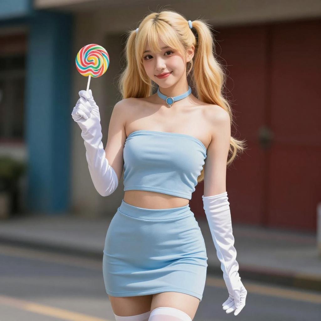 Photograph of a young woman with blonde pigtails, wearing a light blue strapless tube top and matching mini skirt, white gloves, and white thigh-high stockings. She holds a colorful swirl lollipop and smiles slightly. The background is blurred with hints of blue and red.