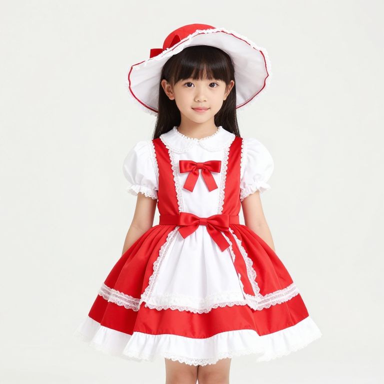 "White Christmas Mrs Claus Dress, dressed in a white dress and red bow posing for a picture"