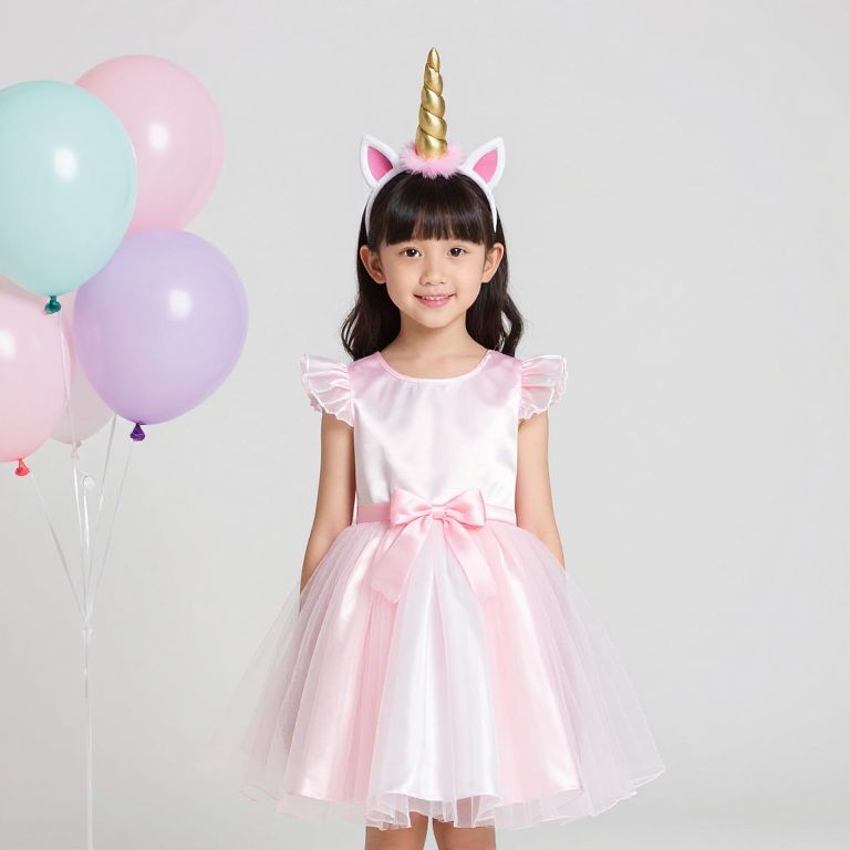 Asian woman with long black hair, red headband, white dress with red bow, standing in front of decorated Christmas trees.