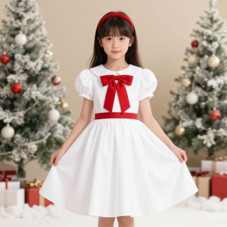 Photograph of an Asian woman with long black hair and bangs, wearing a white, short-sleeved, puffed dress with a large red bow at the chest and a red waistband. She also wears a red headband. She stands in front of two snow-dusted Christmas trees adorned with red and gold ornaments. The background includes blurred gift boxes wrapped in red and white paper. The woman's expression is neutral, and she holds the sides of her dress slightly. The image has a festive, holiday theme with soft lighting and a warm beige wall behind the trees.
