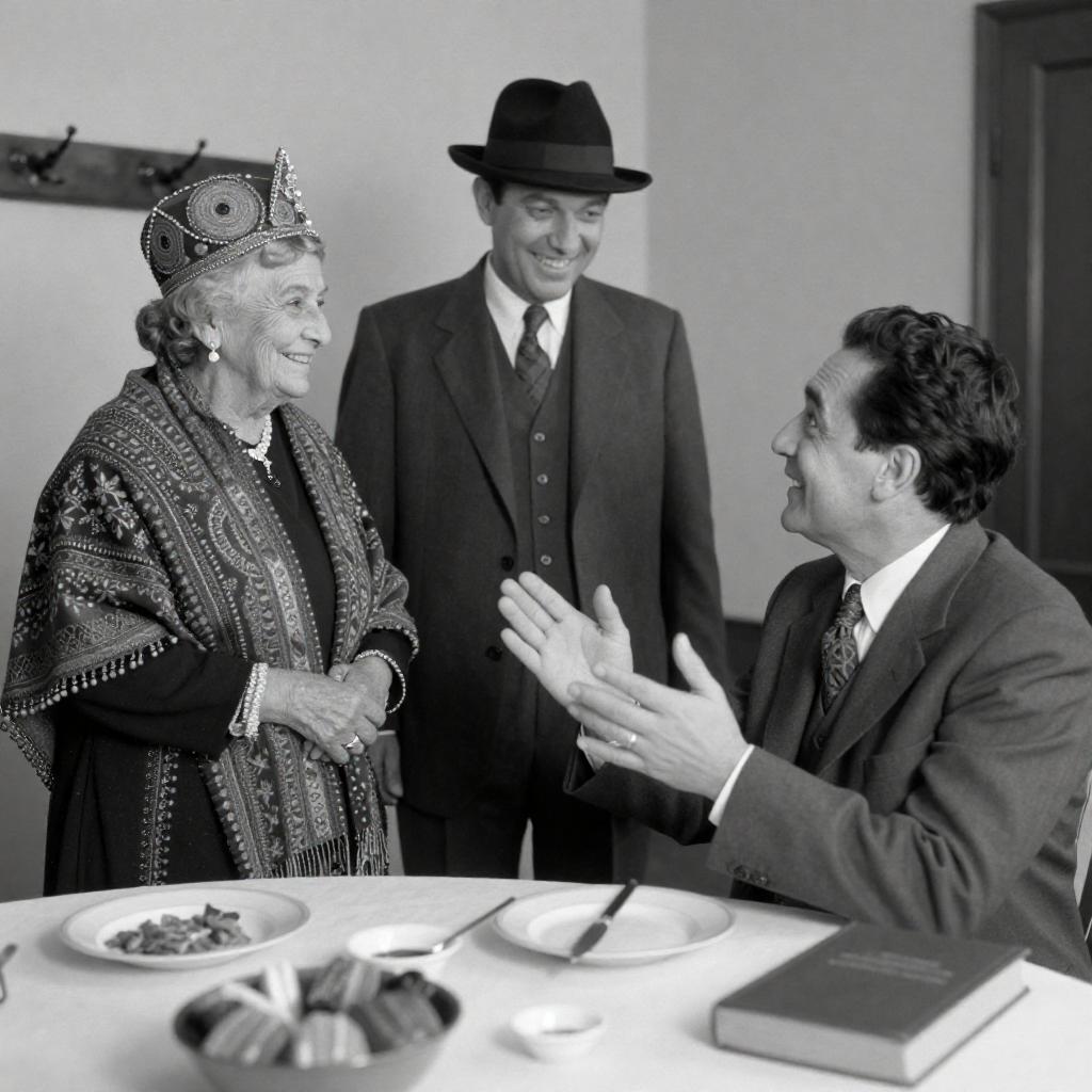 Black and white photograph of three people in a room. Elderly woman with ornate headdress and patterned shawl, smiling, stands beside a laughing man in a suit and hat. Man in suit with dark hair sits at table, gesturing. Table has books, dishes, and a pen. Background has a coat rack.
