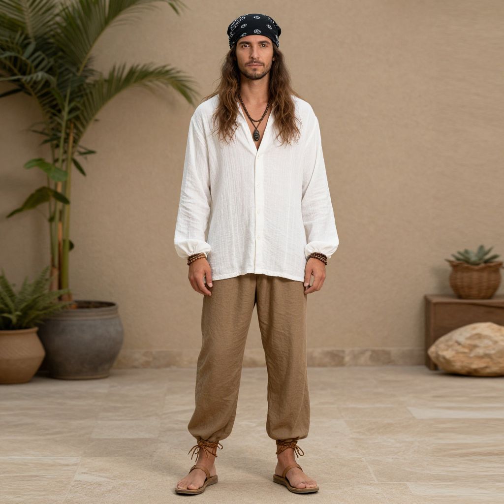 Boho Outfit Male Costume, man with long hair and a bandana in a white shirt