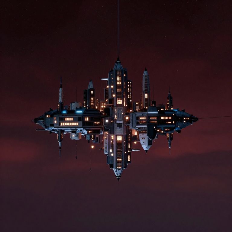 Digital artwork of a futuristic, floating cityscape at night. The city, resembling a triangular spaceship, is adorned with tall, illuminated skyscrapers emitting warm yellow and cool blue lights. The dark, purple-red sky reflects the city's lights, creating a mirrored effect below. The city has a sleek, modern design with sharp edges and geometric patterns. The overall style is reminiscent of sci-fi aesthetics, with a focus on symmetry and high-tech architecture. The image conveys a sense of advanced technology and isolation in space.