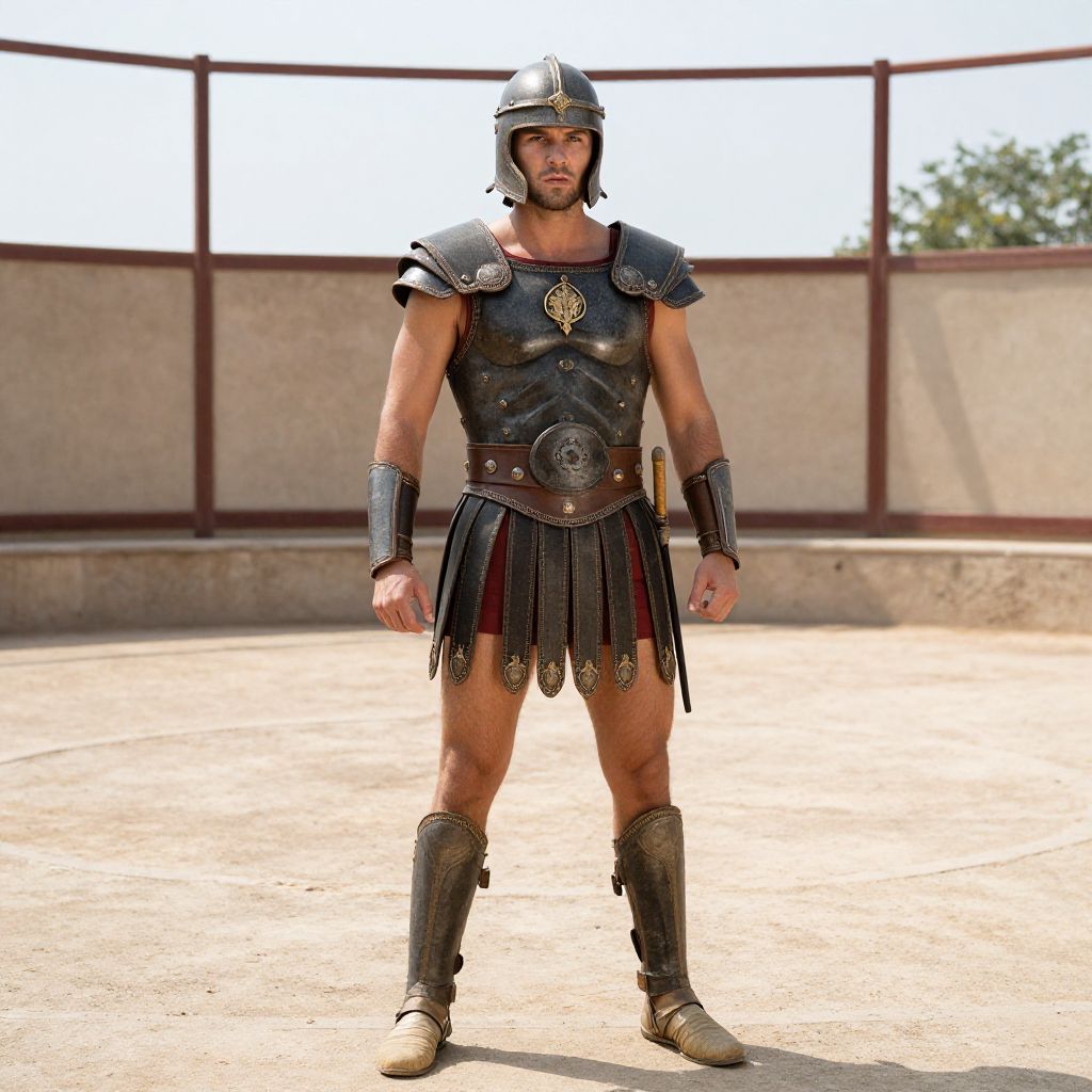 "American gladiator outfit, a man in a gladia outfit standing in a ring"