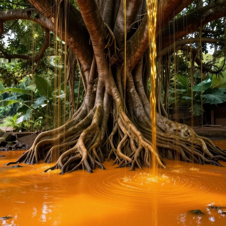 A colossal tree stands rooted in a pool of radiant orange liquid, its gnarled trunk and sprawling roots defying gravity as they emerge from the ground, while tendrils of golden nectar cascade downward like living streams, merging with the shimmering puddle below.