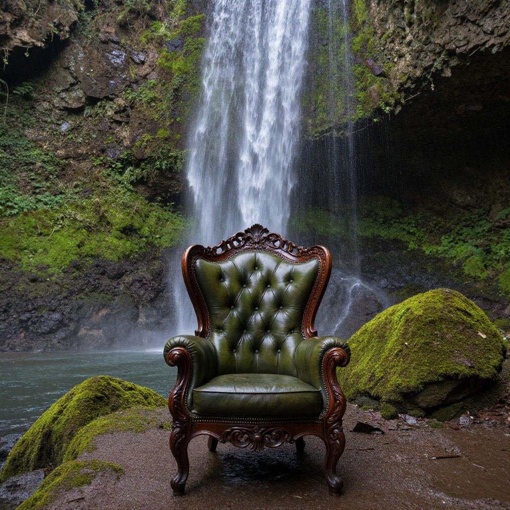 Photograph of a vintage, green, tufted leather chair with dark wooden carvings, placed in front of a cascading waterfall surrounded by