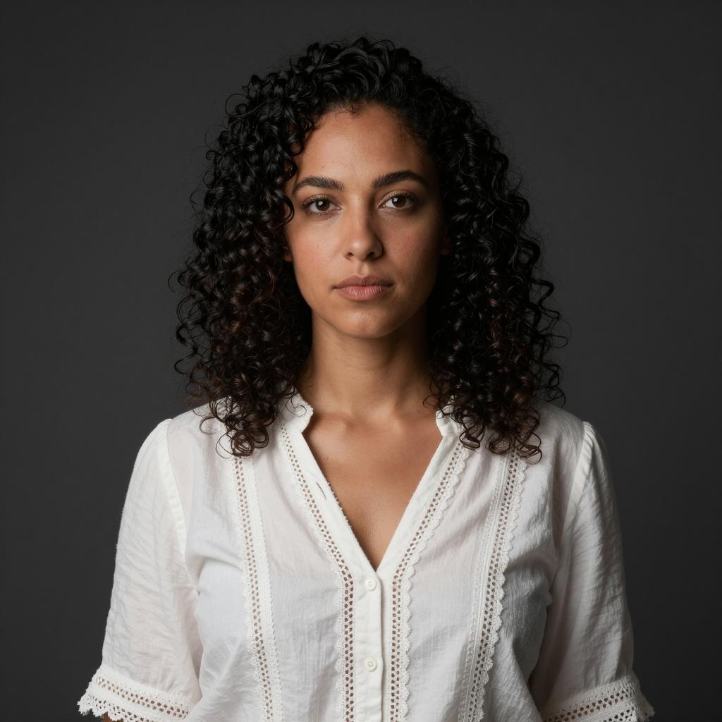 Woman with short curly hair, wearing an off-shoulder black top with lace trim, large hoop earrings, and a bracelet. She leans against a dark brown metal pole, holding it with both hands. Background is a red brick wall. She looks slightly to the side with a subtle, relaxed expression.