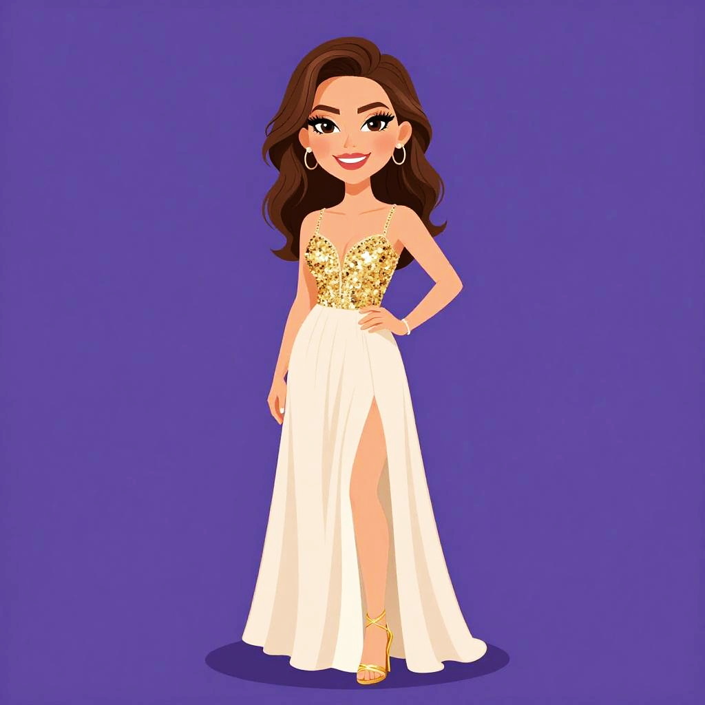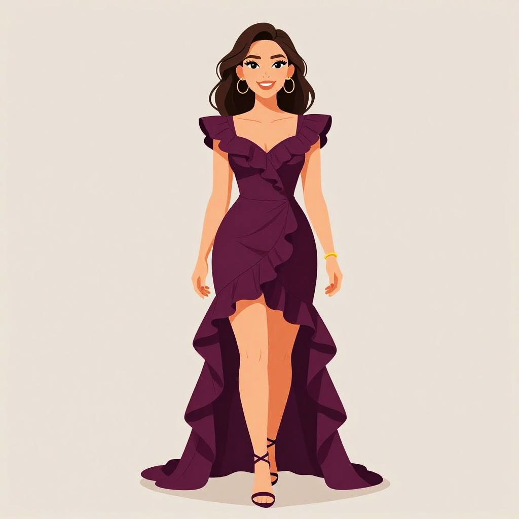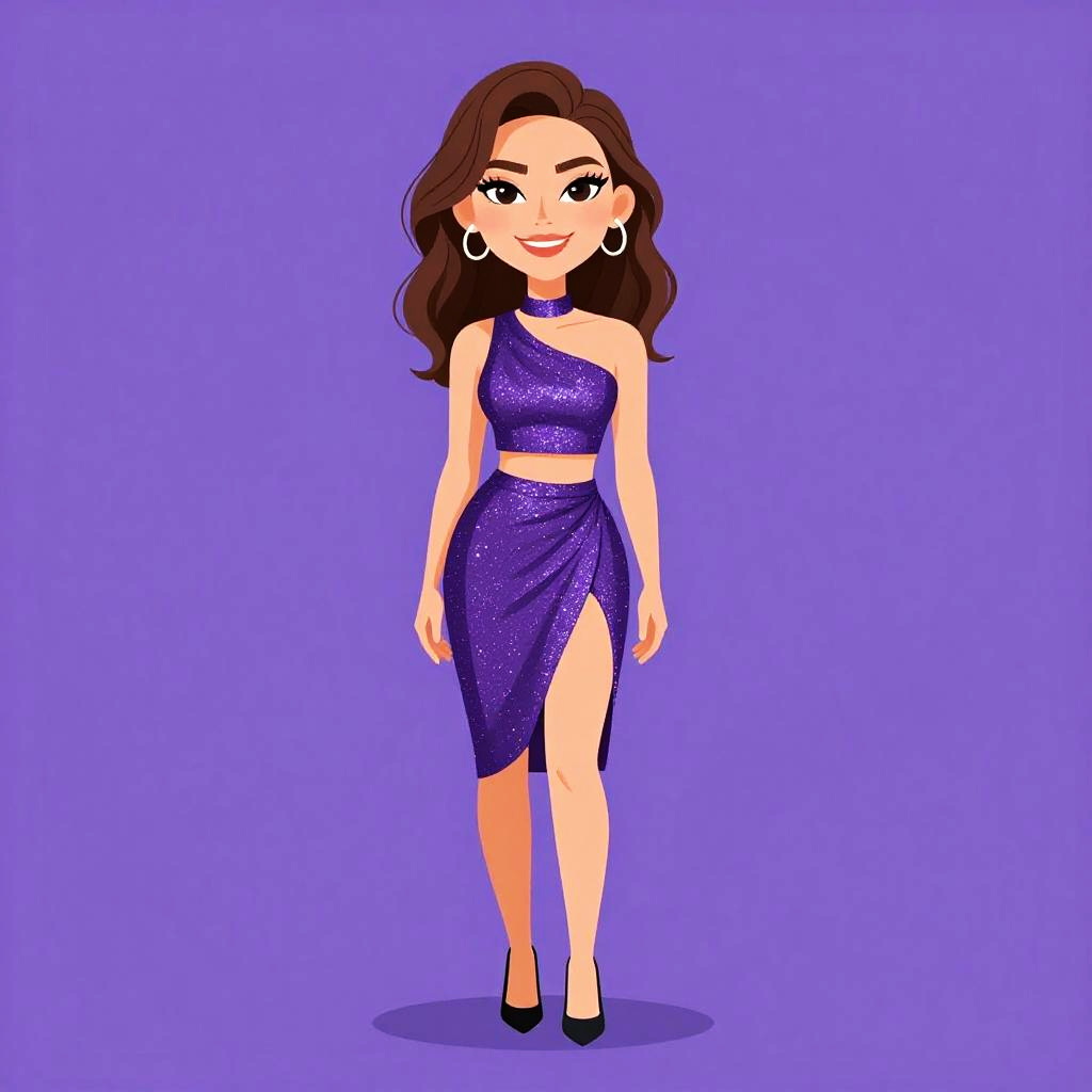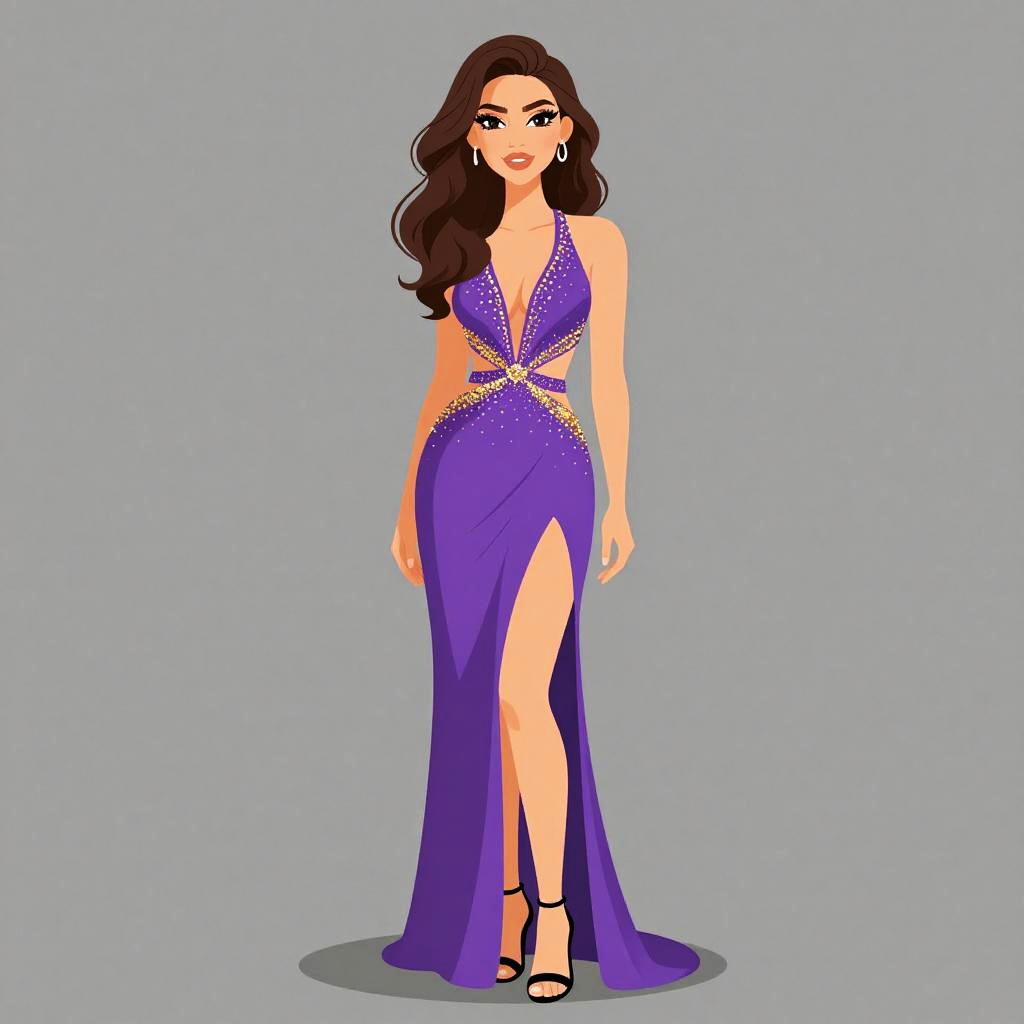 Digital illustration of a stunning woman with long, wavy black hair and fair skin, standing against a plain grey background. She is wearing a deep purple, sleeveless evening gown with a deep V-neckline, embellished with gold studs and a crisscross design on the side. The gown features a high slit on her left leg, revealing black high-heeled sandals. Her makeup is glamorous with bold red lipstick and dark eyeliner. She wears large hoop earrings. The image has a clean, modern, and slightly cartoonish style with smooth lines and vibrant colors.
