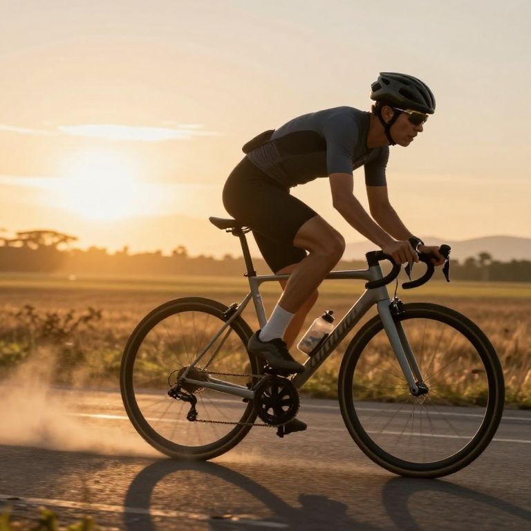 Chronologist pedals furiously on a bicycle constructed with hourglass wheels, kicking up dust as he races against time beneath a golden sunset.