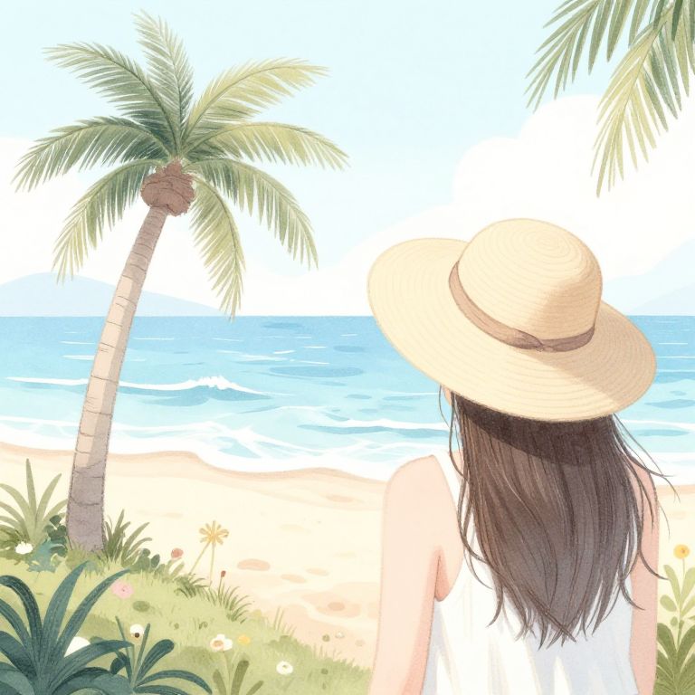 Digital drawing of a serene beach scene. A person with long, dark brown hair, viewed from behind, wears a wide-brimmed beige hat and a sleeveless top. They stand near the foreground, facing a calm blue ocean. A tall, slender palm tree with green fronds is on the left, and lush green grass with small white flowers is at the bottom. The clear sky and bright sunlight enhance the tranquil atmosphere. The style is soft and watercolor-like, with gentle gradients and delicate lines.