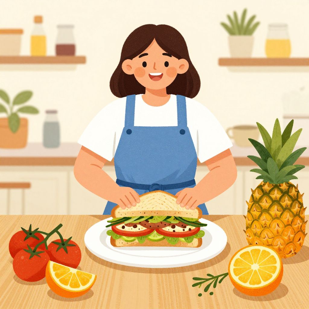 Cecile, our lead illustrator, brings vibrant life to a culinary scene featuring a cheerful woman preparing a hearty sandwich, surrounded by fresh ingredients including tomatoes, oranges, pineapples, and herbs, all set against a warm, inviting backdrop.