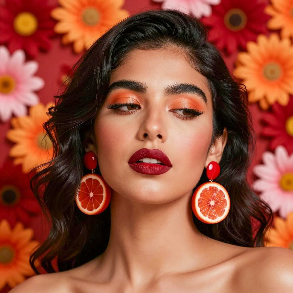 Photograph of a woman with tan skin, black wavy hair, and intense makeup. She has full, dark red lips, orange eyeshadow, and thick black eyebrows. She wears large, round, red fruit-shaped earrings. Her head is tilted slightly back, eyes half-closed. She is set against a vibrant background of colorful flowers in red, orange, and pink. Her shoulders are visible, but she is not wearing a top. The focus is on her face and earrings.