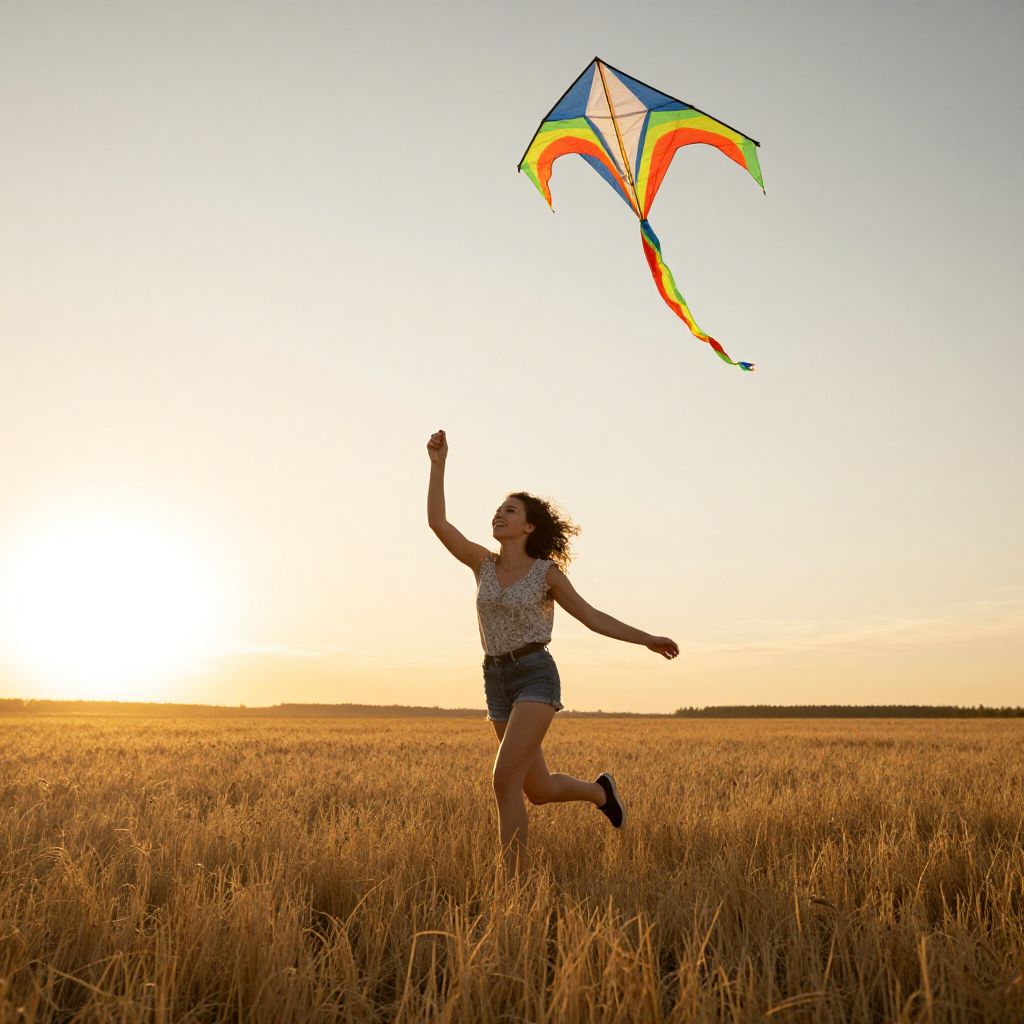 Embracing the boundless spirit of freedom, a woman dashes through a golden field, her laughter carried by the wind as the vibrant kite soars above, symbolizing the pursuit of dreams against the backdrop of a serene sunset.