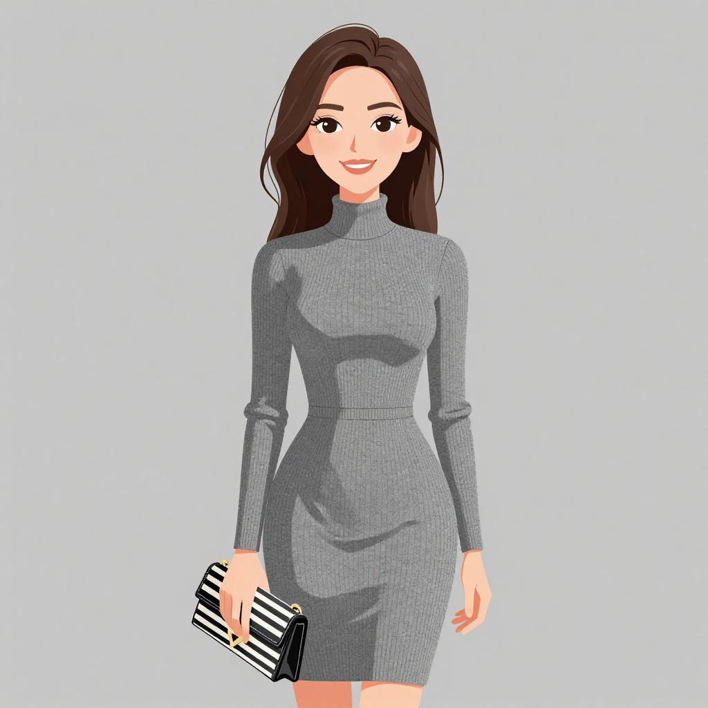 Digital illustration of a smiling young woman with long, straight dark brown hair, wearing a form-fitting, long-sleeved, grey turtleneck dress that accentuates her hourglass figure. She holds a black and white striped clutch in her right hand. Her skin is fair, and she has large, expressive brown eyes. The background is a plain, light blue, making her the focal point. The style is clean and modern, with a slight pixelated texture. The overall composition is simple and elegant, highlighting her stylish appearance.