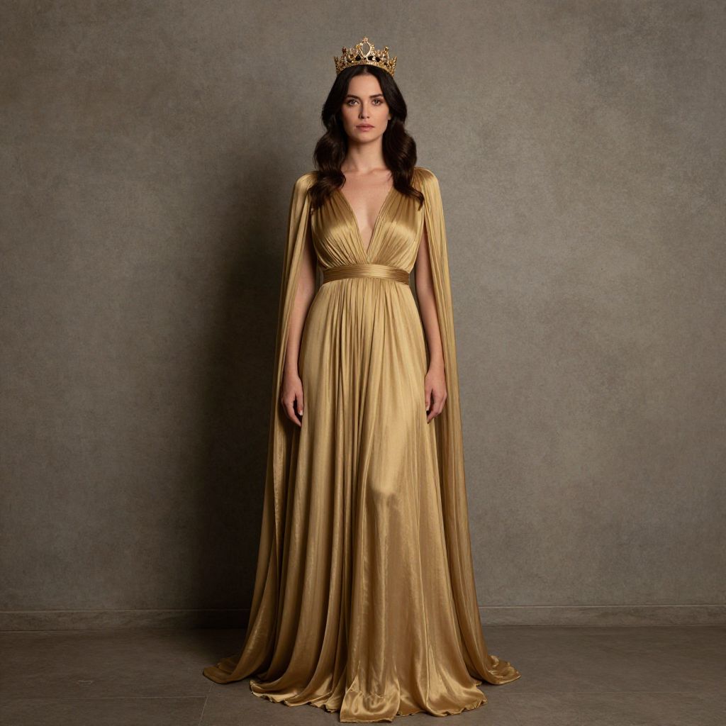 Photograph of a woman standing against a textured gray background. She has long, wavy black hair and is wearing a gold, floor-length gown with a deep V-neck, pleated bodice, and long, flowing sleeves. The dress has a satin-like sheen. She also wears a gold crown adorned with small jewels. Her expression is neutral, and she stands with her arms relaxed at her sides. The lighting is soft, highlighting the texture of the gown and the crown. The overall style is regal and elegant.