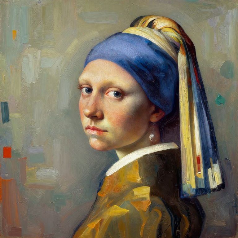 An artistic interpretation of the 'Girl with a Pearl Earring', featuring a woman adorned with a striking blue and yellow headscarf and a prominent pearl earring. The image captures the essence of timeless elegance with a modern twist through its vibrant hues and detailed rendering.