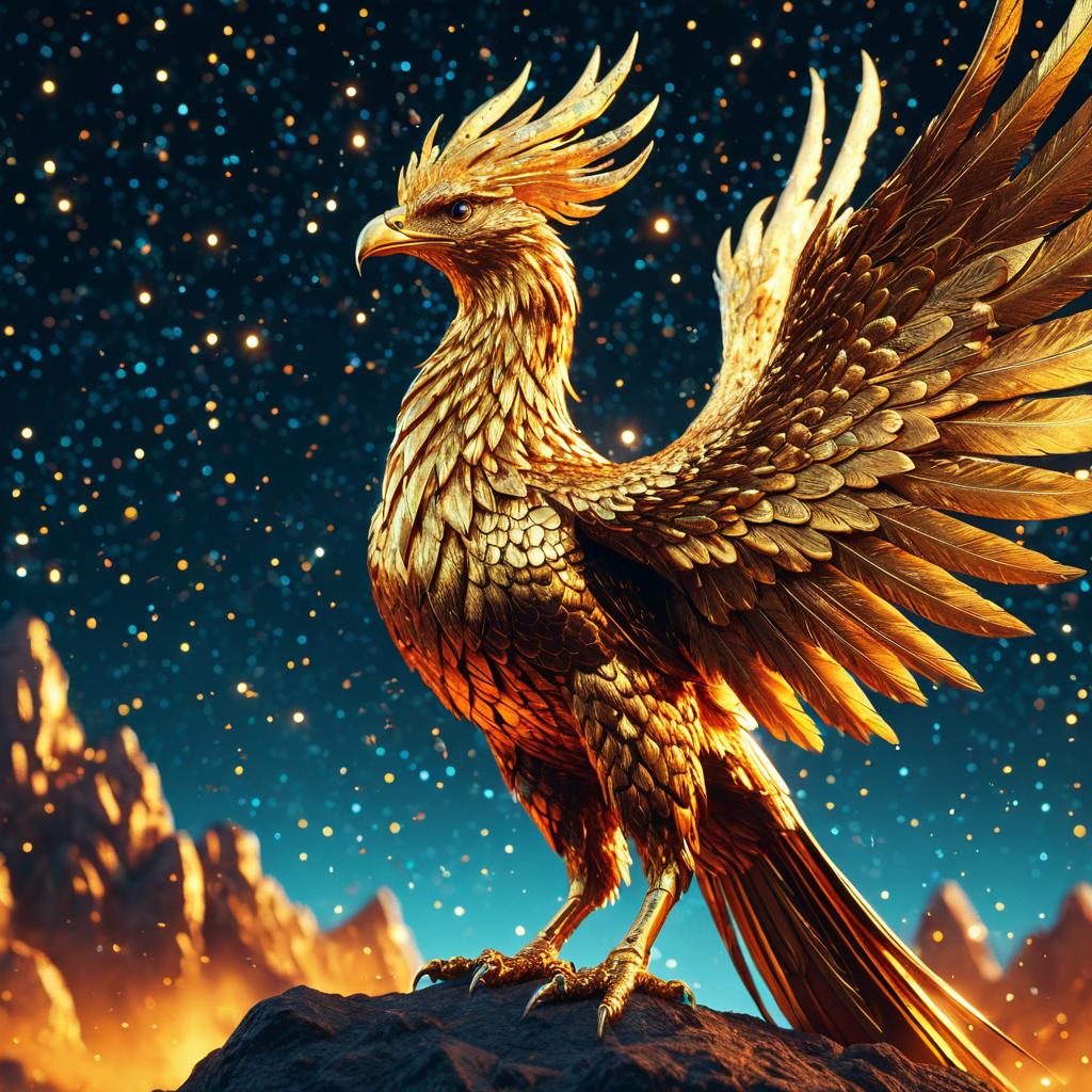 A majestic golden phoenix statue with outstretched wings, glowing vividly against a deep starry night sky. The mythical bird perched on a detailed pedestal, illuminated by cinematic lighting that enhances its intricate feather textures. A stunning celestial backdrop with stars and glowing nebulae adds an awe-inspiring and fantastical atmosphere.