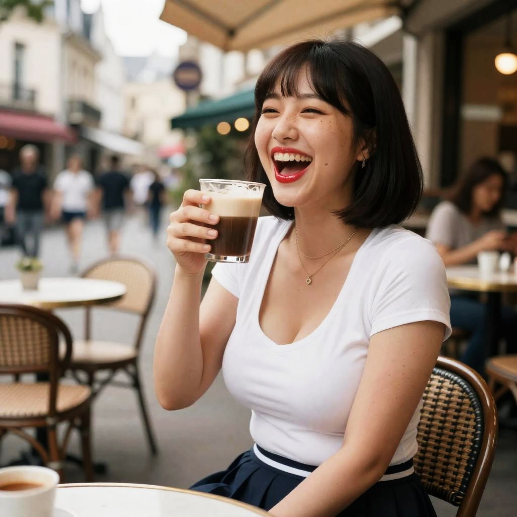 (photorealistic, masterpiece, best quality, levelled out image, extremely detailed, absurdres, 8k uhd, beautiful detailed girl, beautiful detailed eyes, ultra detailed, real skin texture, ultra high res, extremely intricate:1.4), (golden-ratio face, perfect proportioned face, perfectly beautiful), (laughing out loud, funny, very happy:1.3), glossy and red lips, (brown eyes), senior high school student, (k-pop idol, miss korea, korean beauty), (many moles on skin), (short torso, long legs, huge hips, huge naturally sagging breasts:1.3), (1girl, solo girl, wide angle shot, wide shot:1.3), shirt, tennis skirt, cleavage, near serene park in the middle of a bustling city, she is sitting on a chair and drinking coffee in a old european cafe, earrings, necklaces, blunt bangs with a bob