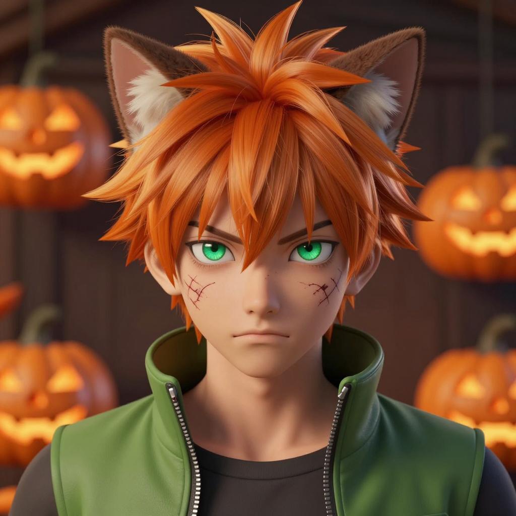 Close-up 3D digital portrait of a young anime-style man with spiky orange hair and green eyes. He has cat ears and facial scars, wearing a green sleeveless jacket over a black shirt. The background features blurred glowing orange jack-o'-lanterns, creating a Halloween-themed atmosphere. The character has a serious expression and slightly messy hair, rendered with high detail and soft lighting.