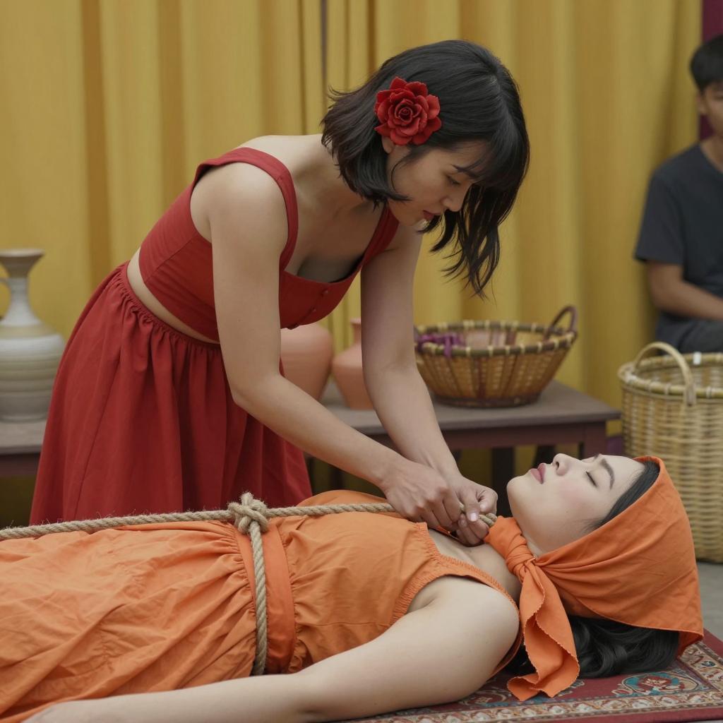 Woman in red dress with short hair and red flower in hair leans over woman in orange headscarf and orange dress. First woman holds rope tied to second woman's neck, pulling it tighter. Background includes yellow curtains, pottery, and baskets. Second woman lies on table with eyes closed. Two people. Intense expressions. Color photograph.