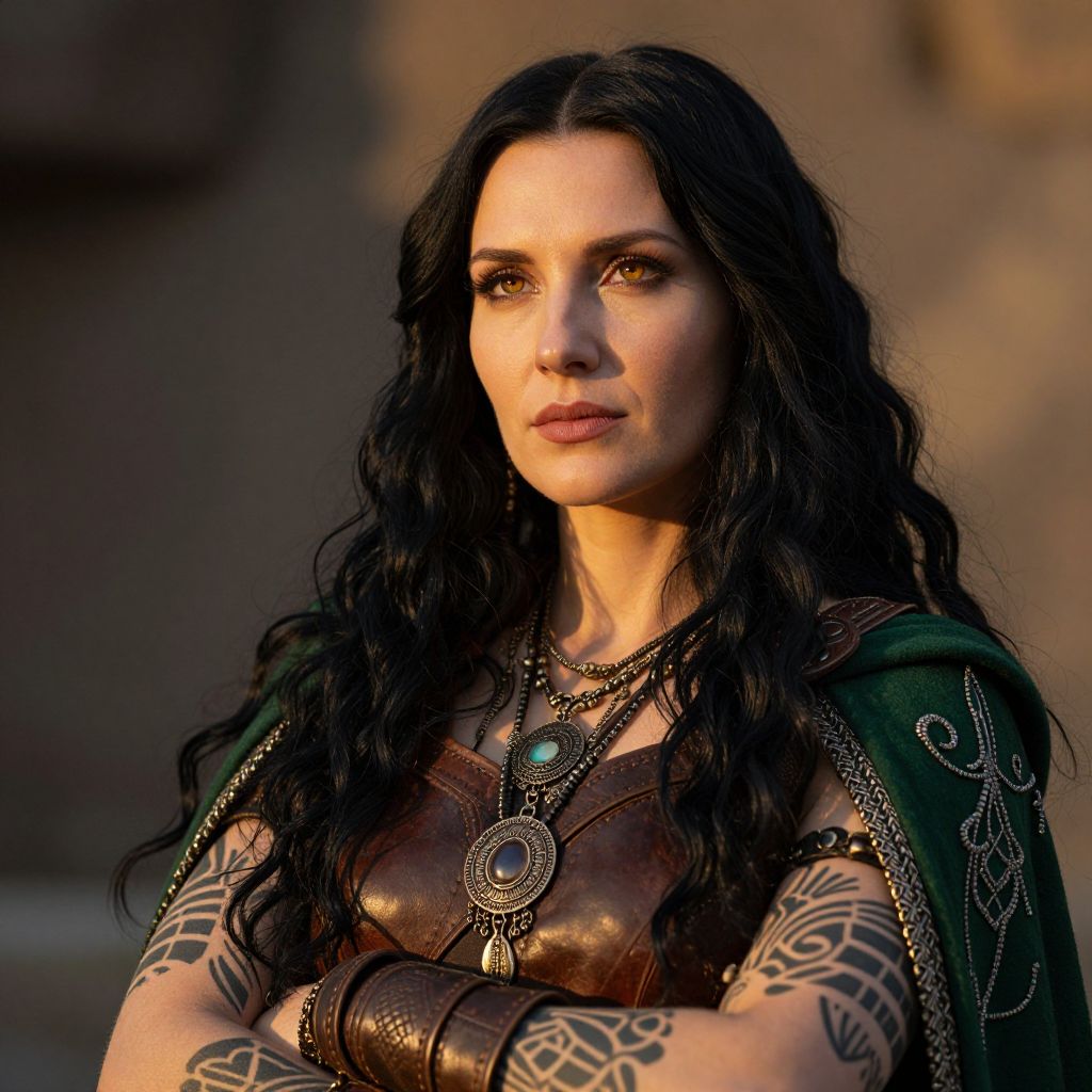 Photograph of a woman with long, wavy black hair and fair skin, wearing a brown leather armor top adorned with intricate silver chains and a large, circular pendant. She has a serious expression and is looking directly at the camera. Her arms are crossed, revealing black geometric tattoos on her forearms. She wears a green, patterned cloak draped over her shoulders. The background is softly blurred with warm, golden sunlight, creating a dramatic, medieval atmosphere. The image has a cinematic quality, resembling a character from a fantasy film.