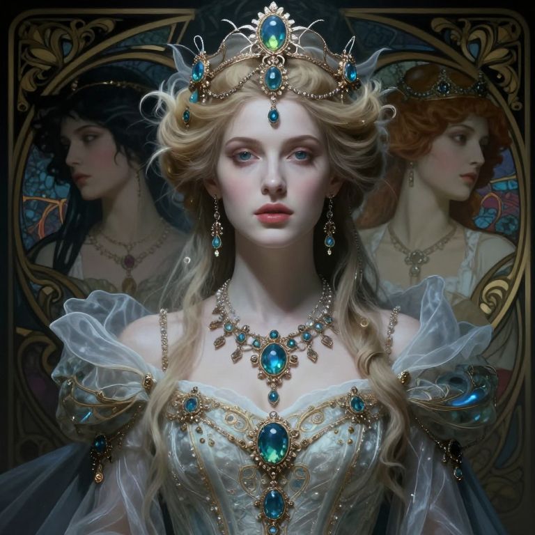 This is a digital painting of a fair-skinned, blue-eyed blonde woman with wavy hair adorned with a jeweled crown. She wears an opulent, off-shoulder gown with translucent, puffed sleeves and intricate gold and turquoise jewelry, including a large pendant on her chest and matching earrings. Her expression is serene. In the dark, ornate background, there are two side profiles of other women with different hair colors (black and red) and similar regal attire, framed within an elaborate, circular design. The image has a fantasy, Victorian-inspired style with a high level of detail and realism.