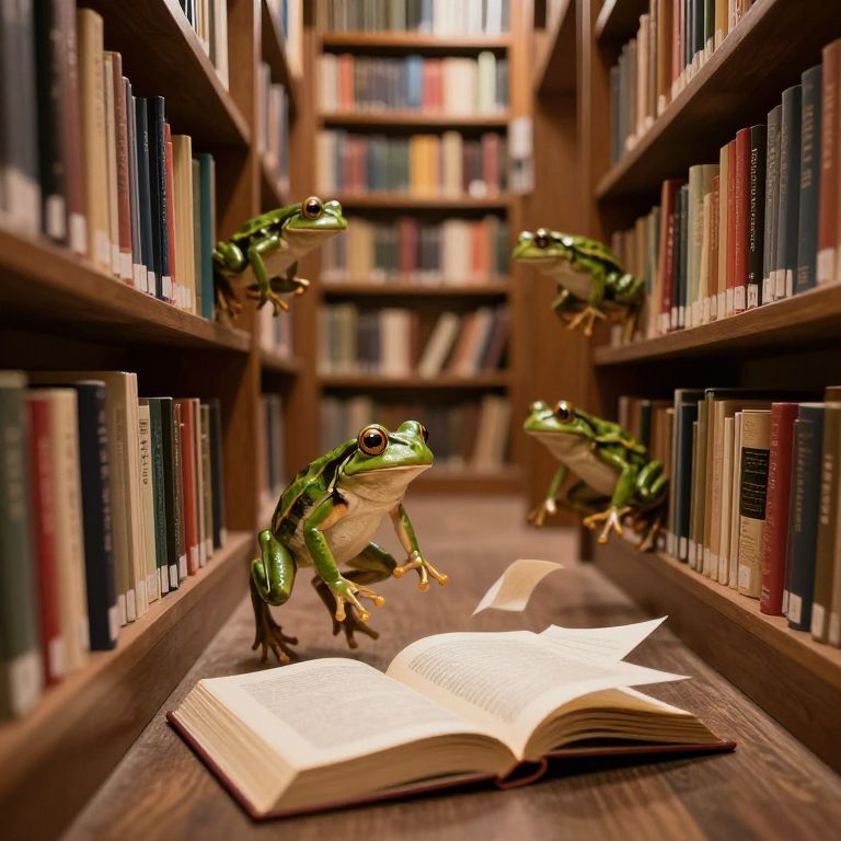 Photograph of a library aisle with wooden bookshelves on both sides, filled with colorful books. Four green frogs with brown eyes and dark green stripes are jumping towards an open book on the floor. The frogs are positioned in a semi-circle, with three in mid-air and one about to land. The book on the floor is white with visible text. The background shows more bookshelves filled with books, creating a warm, wooden atmosphere. The image has a slight, whimsical effect, emphasizing the frogs' playful behavior amidst the library setting.