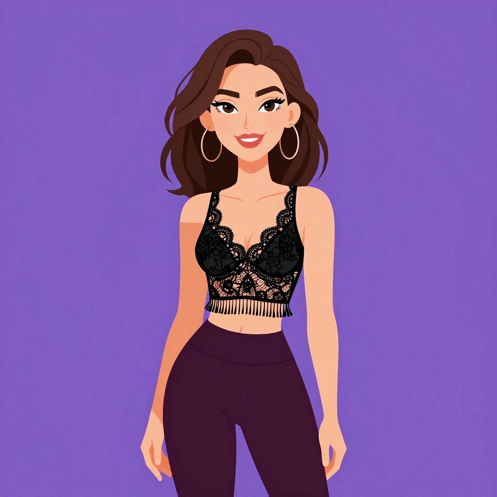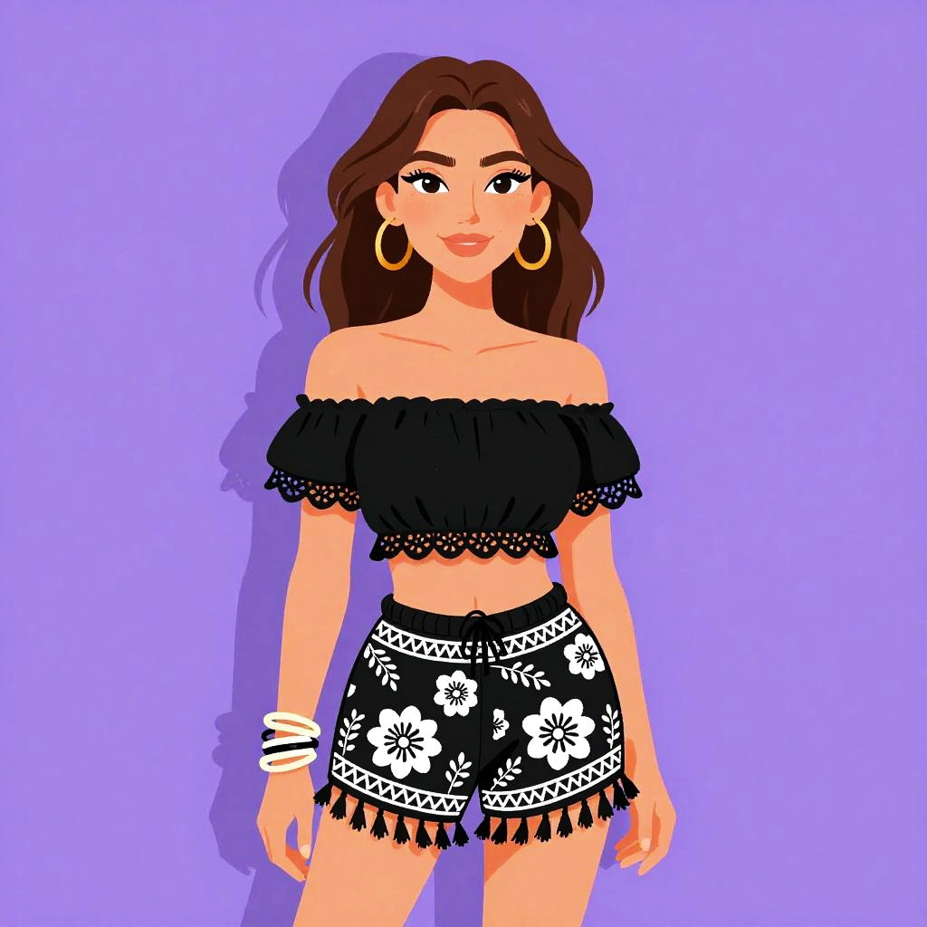 Woman with pretty face and pretty hair. smiling Woman, girly style, cream lace camisole top with thin straps, V-neckline, fitted waist with cut-out crochet detailing, flared skirt with intricate black and white paisley patterns, knee-length, red embroidered trim along hemline. --sref 1467
