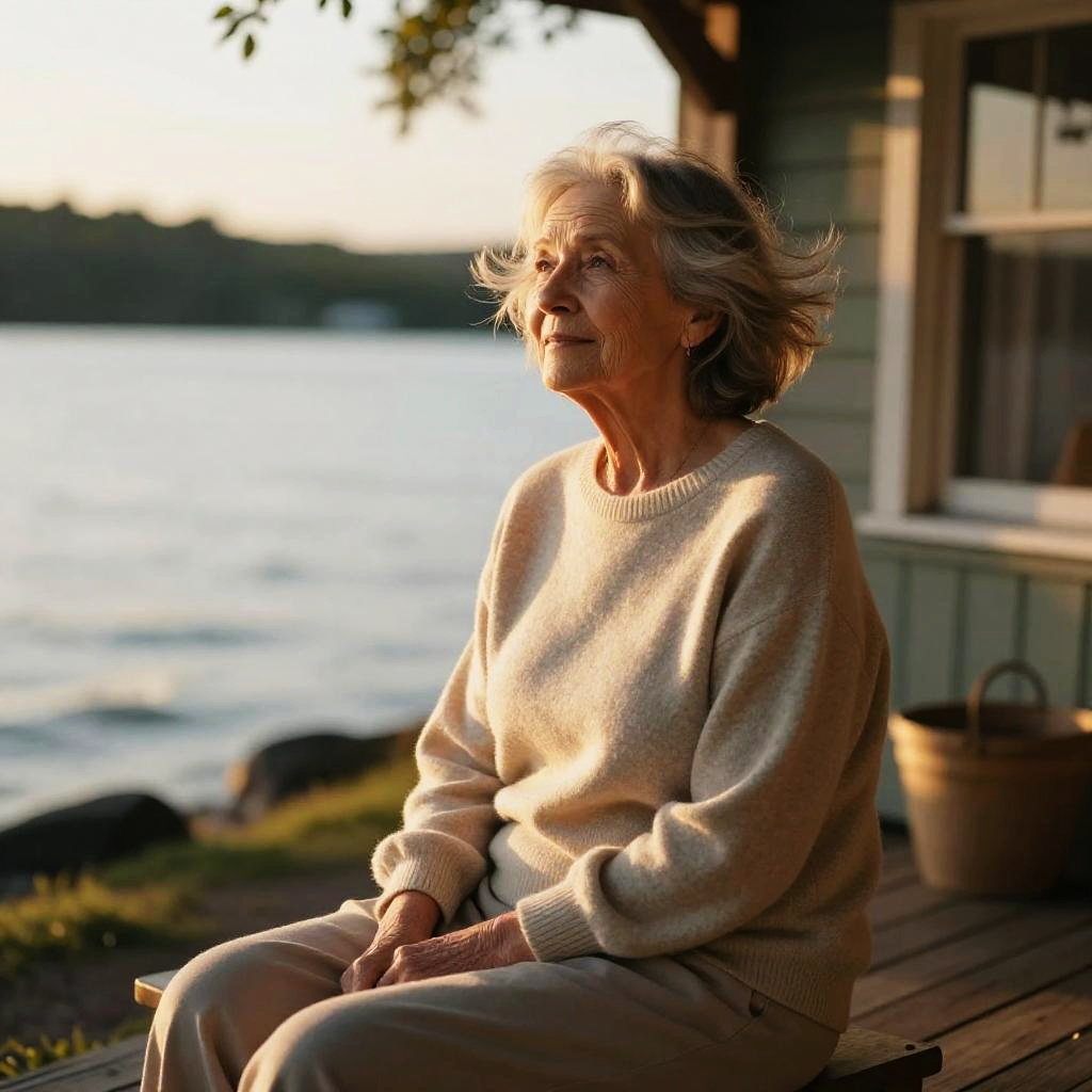 Messy Bun hairstyle on elderly woman, wearing cozy sweater, in cottage interior, captured in fashion editorial style with soft candlelight.