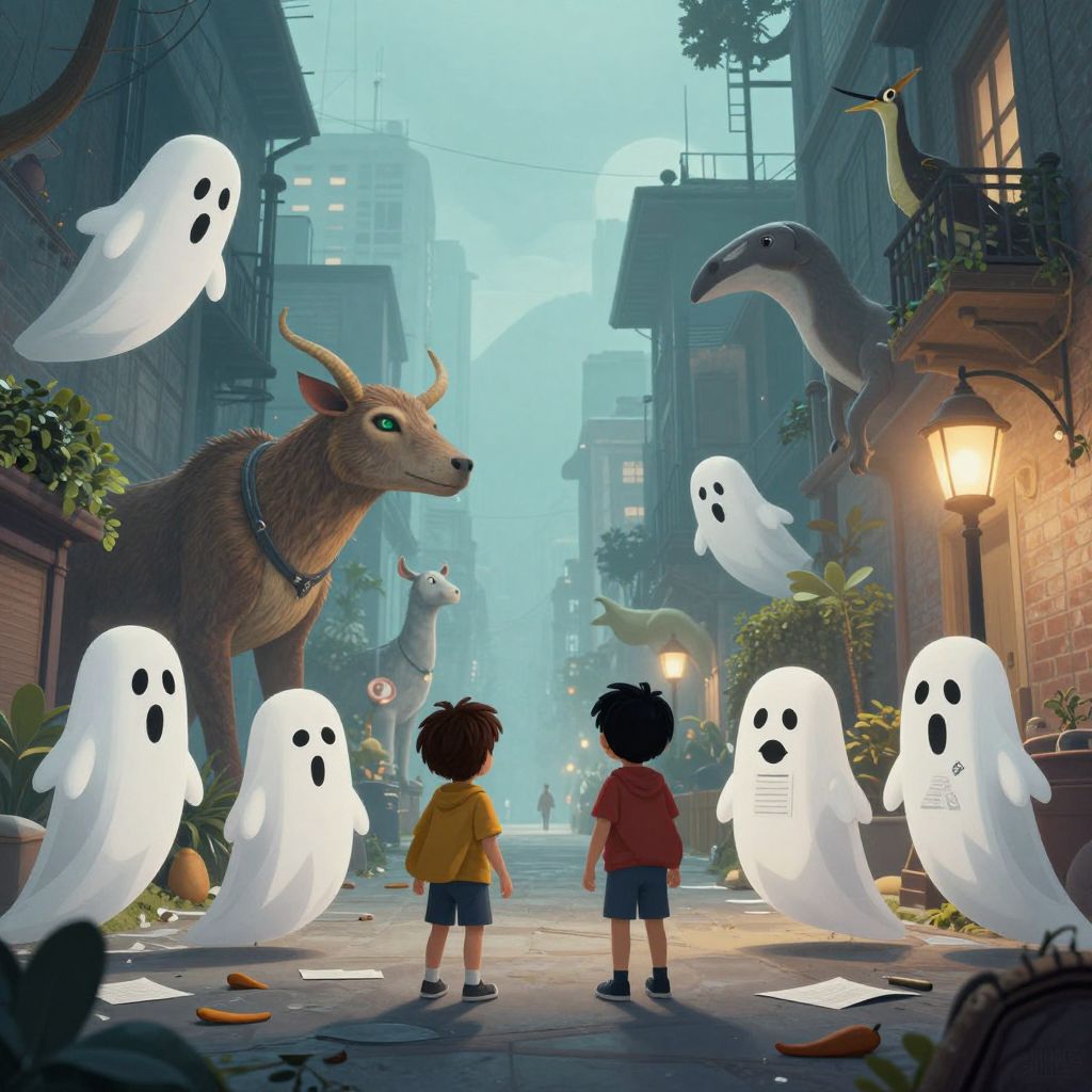 This vibrant digital illustration depicts a magical urban alleyway at dusk, where two children, one in a yellow shirt and blue shorts, the other in a red shirt and blue shorts, stand facing a group of whimsical white ghosts with simple black eyes and mouths. A large, fantastical goat with blue eyes and curved horns looms in the background, alongside a flying bird and a small green creature. The alley is lined with brick buildings, potted plants, and a glowing street lamp, creating a mystical, storybook-like atmosphere. The blue sky and misty background enhance the enchanting, surreal quality of the scene.