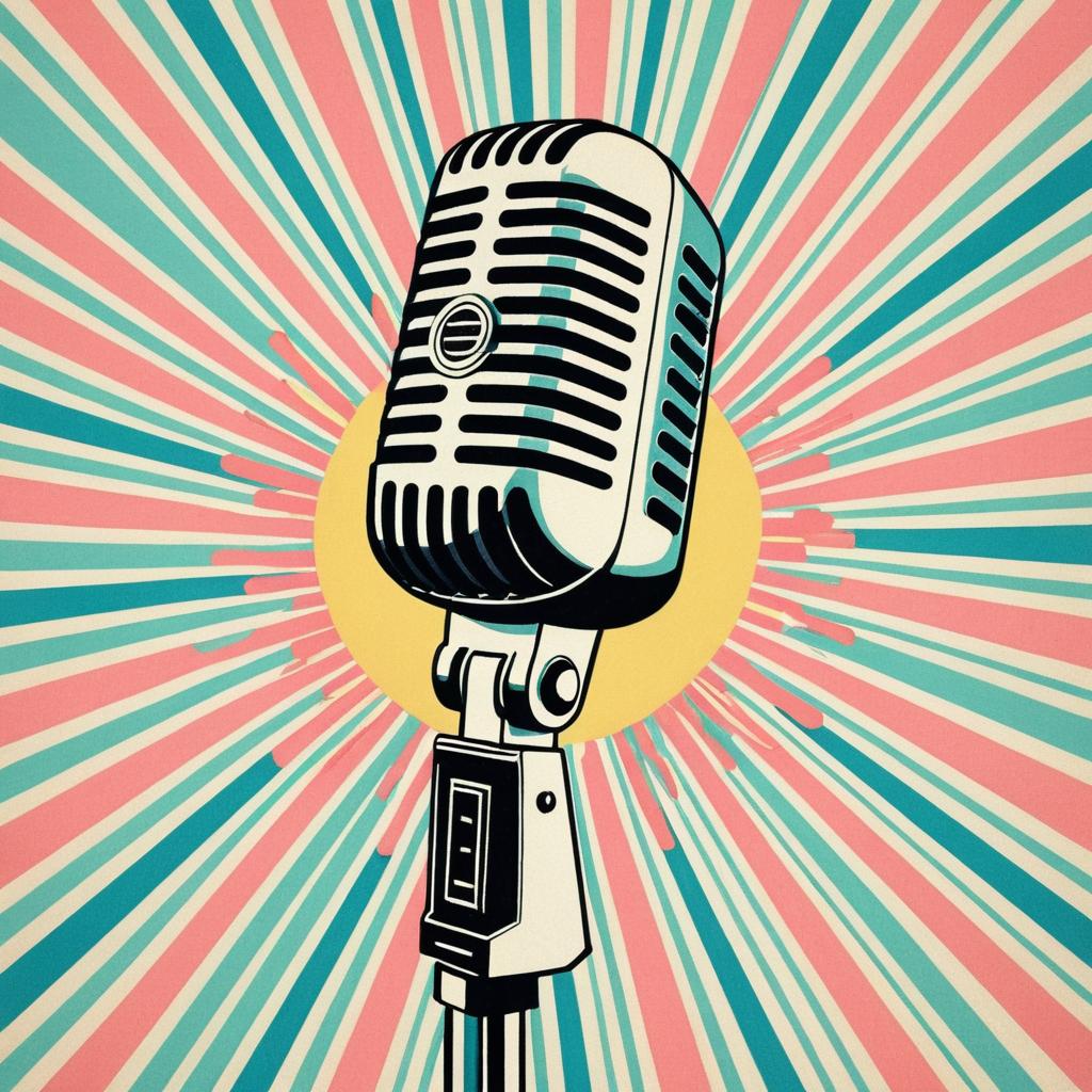Artwork featuring a vintage microphone in classic pop art style inspired by Andy Warhol. The background showcases radiating sunburst lines in pastel shades of teal, yellow, and pink, emphasizing the retro theme.