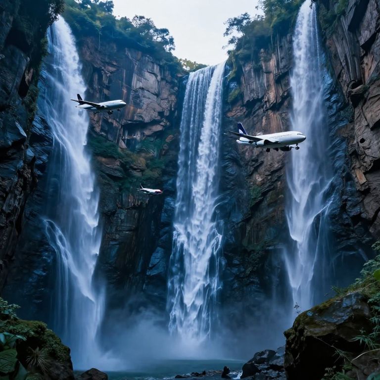 Photograph of a towering waterfall with multiple cascading streams, surrounded by dark cliffs and lush greenery, featuring several small planes flying through the mist.