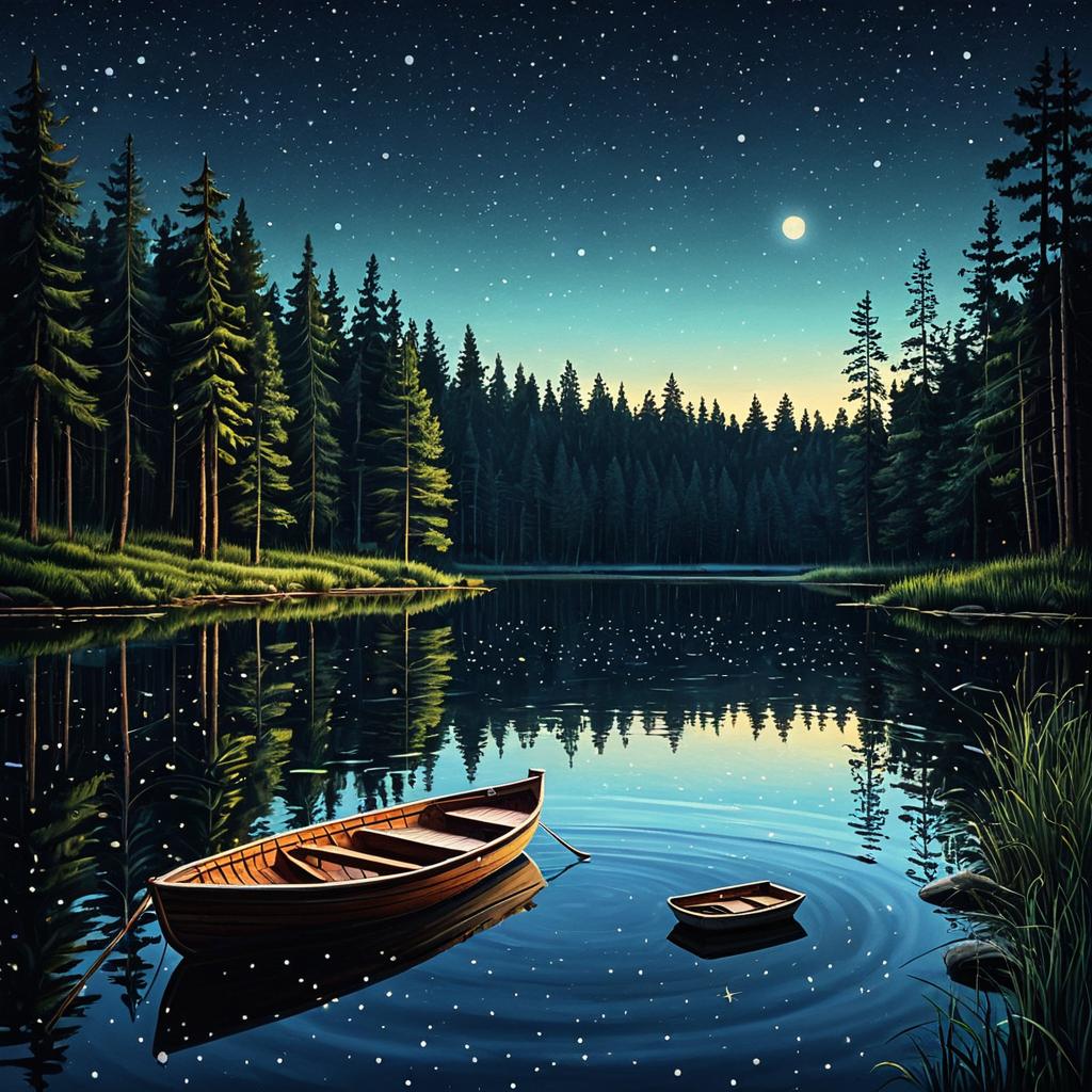 A serene forest pond at twilight featuring a wooden boat floating calmly on still water. The scene shows tall pine trees reflected in the pond, with a clear sky filled with twinkling stars. The water surface has gentle ripples and pearl-like highlights, creating a peaceful and tranquil atmosphere.
