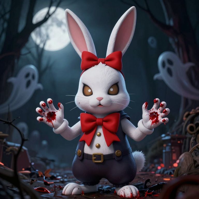 CGI digital artwork of a white anthropomorphic rabbit standing in a dark, eerie forest at night. The rabbit has large, expressive brown eyes, tall pink-tipped ears, and is wearing a red bow on its head, a red bowtie, and black pants with a gold belt. Its paws are raised, showing blood-stained claws. The background features a full moon, ghostly figures, and twisted, barren trees. The scene is illuminated with a spooky blue and red light, enhancing the creepy atmosphere. The rabbit's serious expression adds a sinister touch to the otherwise cute character.