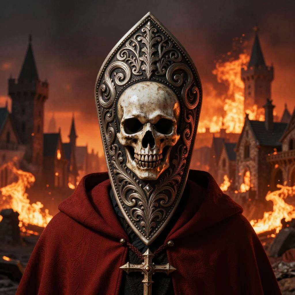 Inquisitor hat with elaborate engravings and a sinister skull emblem, paired with a crimson robe, set against a backdrop of a burning medieval village, dramatic orange and red hues