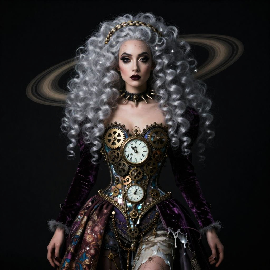 A surrealist cosmic baroque fusion inspired by the works of Salvador Dali. The subject has nebula-silver hair piled into voluminous curls threaded with tiny glowing stars and a braided halo resembling Saturn's rings, and she dons an antique clockwork corset encrusted with mother-of-pearl and brass gears, layered over a melting-clock brocade skirt and a tattered velvet tailcoat, accessorized with a spiked choker.
