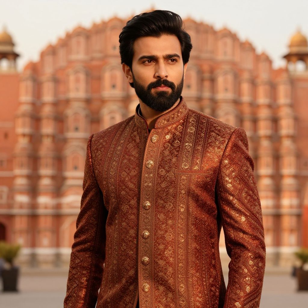 Handsome dark Indian man with a neatly groomed beard, wearing a royal sherwani in rich colors, ornate patterns, standing in front of ancient Indian palace architecture, warm toned lighting, highly detailed and realistic digital painting