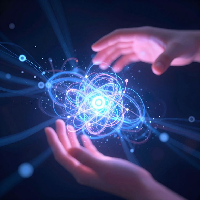 Digital artwork depicting two glowing, human hands holding a bright, luminous blue energy sphere in a dark blue background. The hands, with soft pink and white lighting, frame the glowing sphere, which is composed of interconnected, swirling blue lines and small white dots. Radiating lines extend from the sphere, enhancing its vibrant, magical appearance. The overall composition is dynamic, with a futuristic, ethereal feel. The texture of the hands is smooth, contrasting with the intricate, glowing patterns of the sphere. The background is completely black, emphasizing the vivid colors and light effects.
