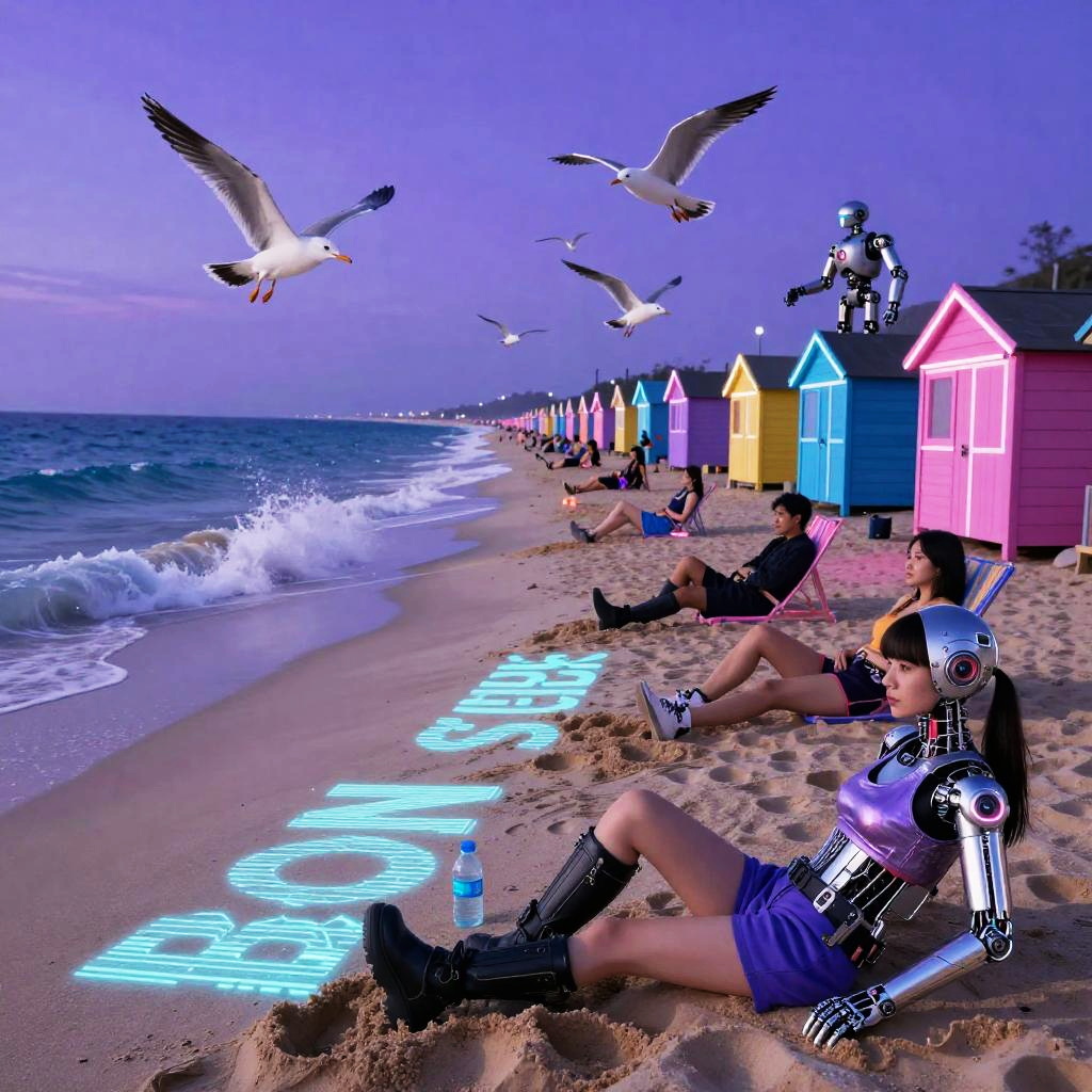 Photograph of a beach at dusk with colorful, triangular beach huts in pink, yellow, blue, and purple lining the shore. A woman with a cyberpunk-inspired outfit, featuring a purple top, black shorts, and metallic arm armor, lies on the sand with neon blue "LOVE" written in the sand in front of her. She wears black knee-high boots and a headband with a visor. Seagulls fly above, and a robotic figure perched on a hut's roof adds a futuristic touch. Waves gently crash onto the shore to the left, and a blue water bottle rests beside her. The sky is a gradient of purple and blue.