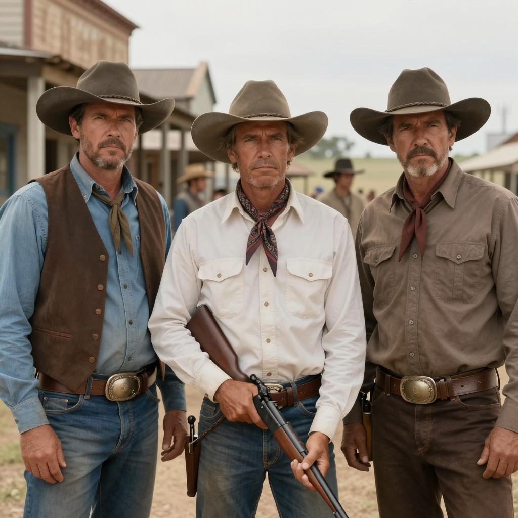 Group of men dressed in 19th-century Western clothing seated in a crowded arena. Four central figures wear brown wide-brim hats, dark blue coats, beige vests, colored neckerchiefs, and leather gloves. They have long hair and some have beards. The background shows more men in similar historic attire with serious expressions.