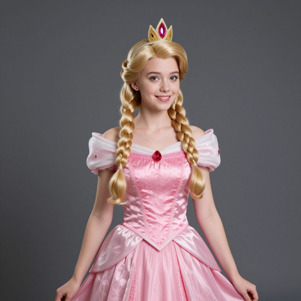 Princess aurora costume girl, solo, 1girl, twin braids, dress, realistic, blonde hair, crown, braid, pink dress, cape, long hair, tiara, parody