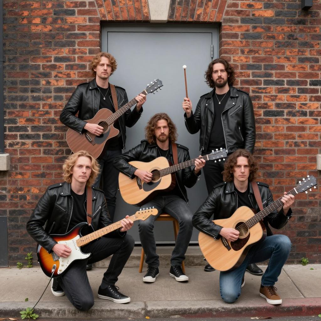 Five young men on a metal bridge, urban background. Red brick building with arched windows. One stands, one sits, three climb. Dark clothing, leather jackets, jeans. Bridge has crisscross metal beams. Daylight. One with glasses, one holding a stick. Greenery on left. Intense expressions. Cinematic style.