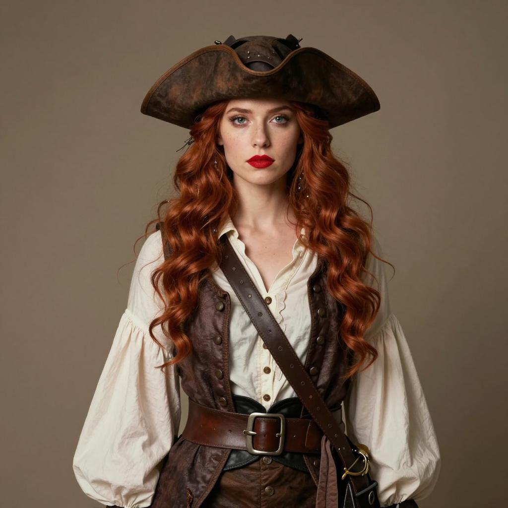 Woman pirate wench costume, photorealistic portrait of a young woman, pirate costume, detailed clothing, brown tricorn hat with red ribbon, long blonde braid, white lace collar, red and white puffed sleeves, brown vest, white and red shirt, brown belt with buckle, confident expression, standing on a wooden ship deck, sunlight, background blurred ship sails, realistic lighting, high detail, digital art, fantasy, historical cosplay, vibrant colors, daytime, outdoors, realistic ures