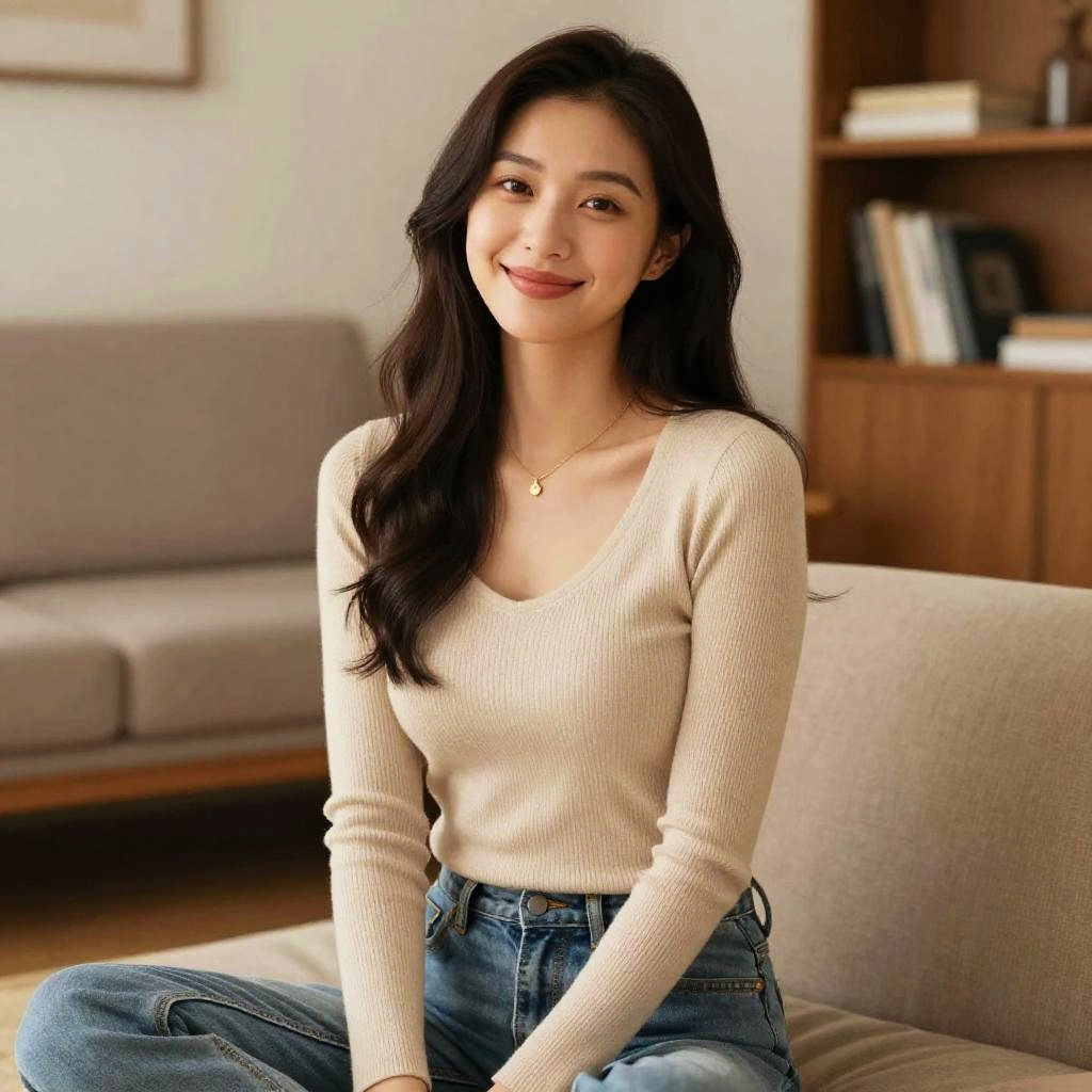 Asian milfs, cozy home setting, warm tones, relaxed and smiling, wearing stylish casual clothes, portrait photography style